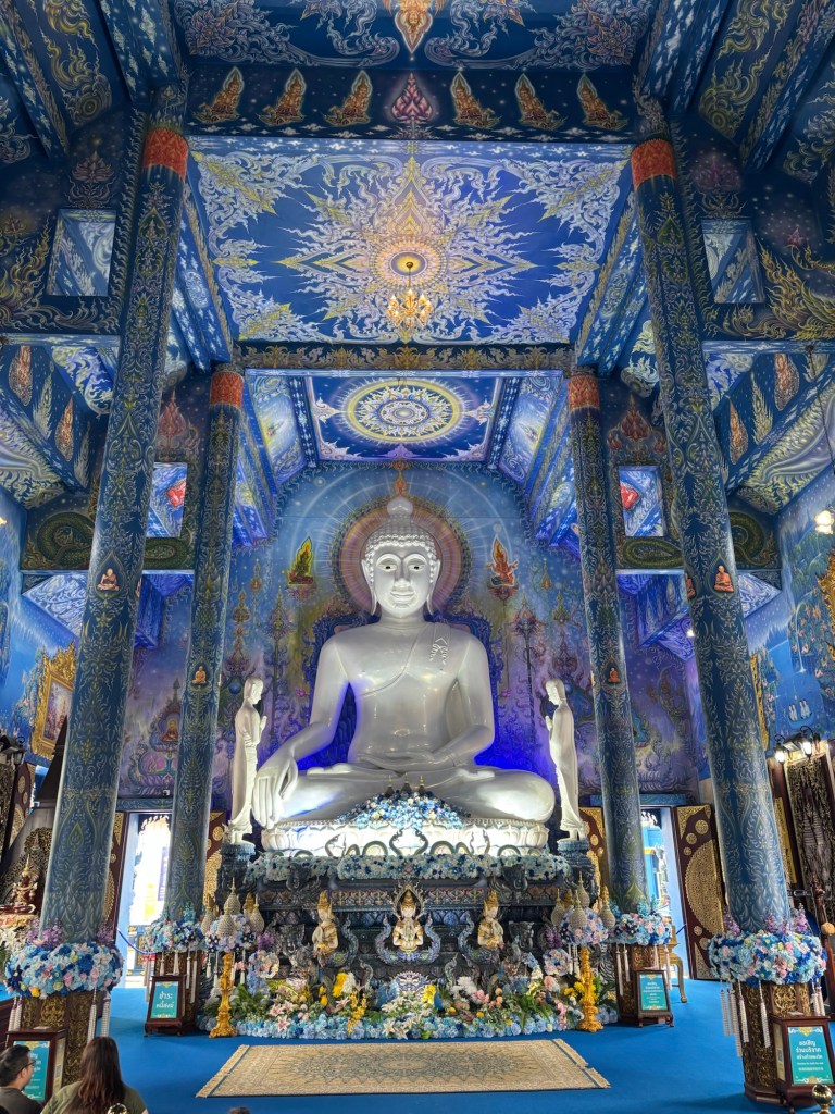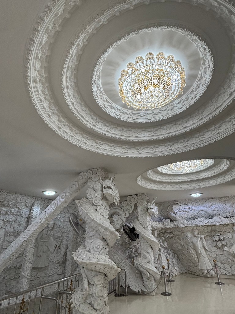 Much to our surprise, the bus driver pulled up at another service station for his lunch break where we could explore the famous Wat Rong Khun. This white temple was built by a master artist called Chalermchai Kositpipat and opened in 1997. It will eventually have nine separate buildings and is predicted to be finished in 2070, by which time we will be 73 so maybe see you then!
