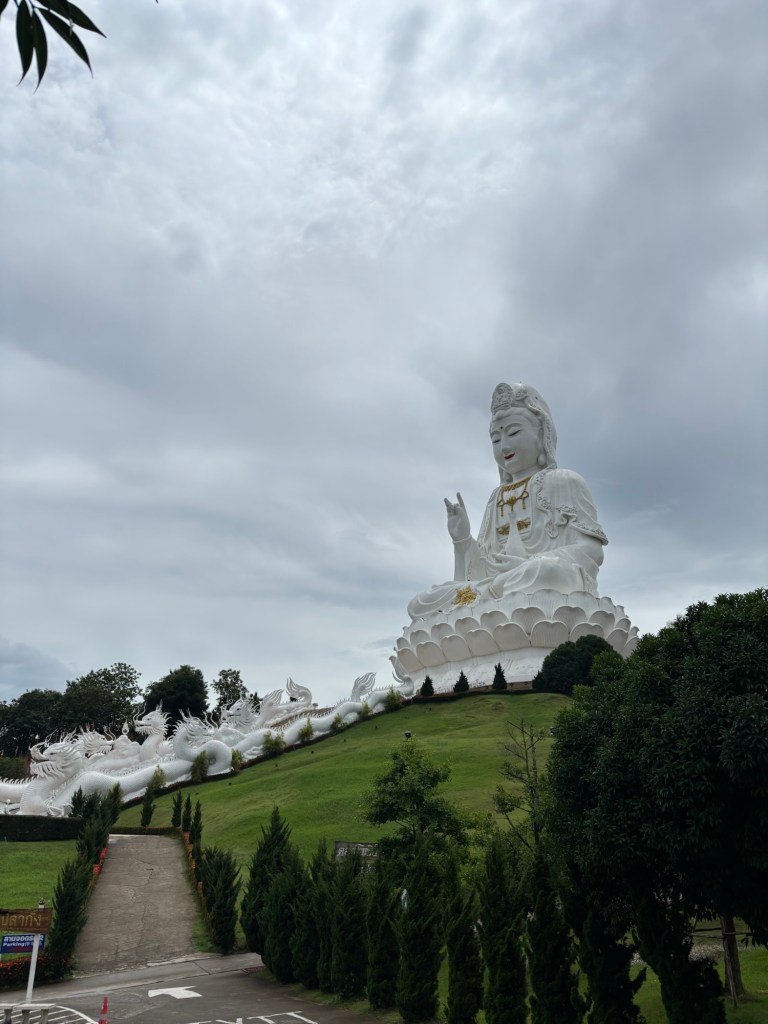 This afternoon we visited the Wat Huay Pla Kang temple complex which includes a 90 metre statue of Guanyin. With it being 2 metres off the tallest statue in Thailand it was very impressive. We paid 80 baht (91p each) to take the elevator up 26 floors which takes you into the ‘head’ of the statue. Legs were wobbling!
