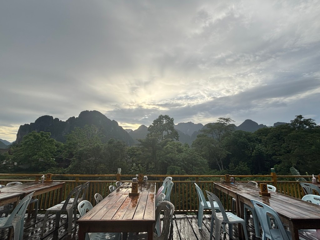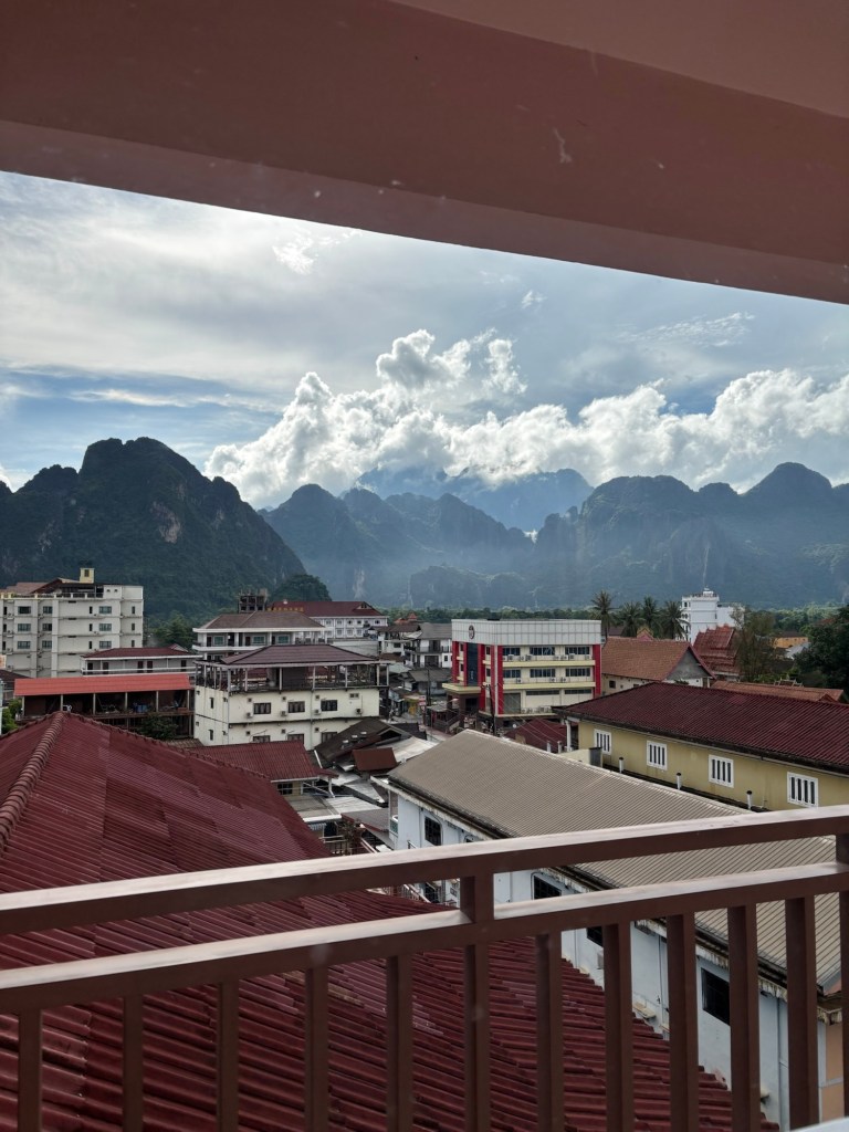 Our hotel in Vang Vieng is the biggest we’ve stayed in so far and we’re on the 7th floor so there’s a great view! Just a shame about the breakfast…