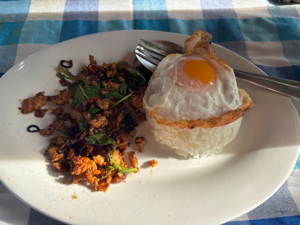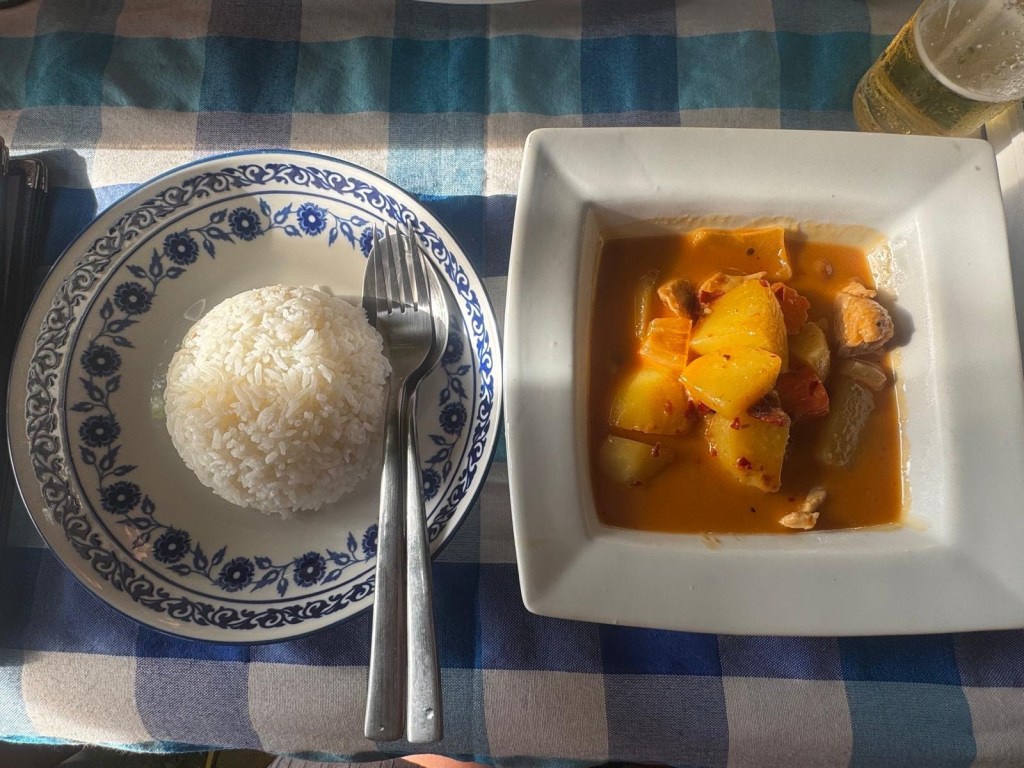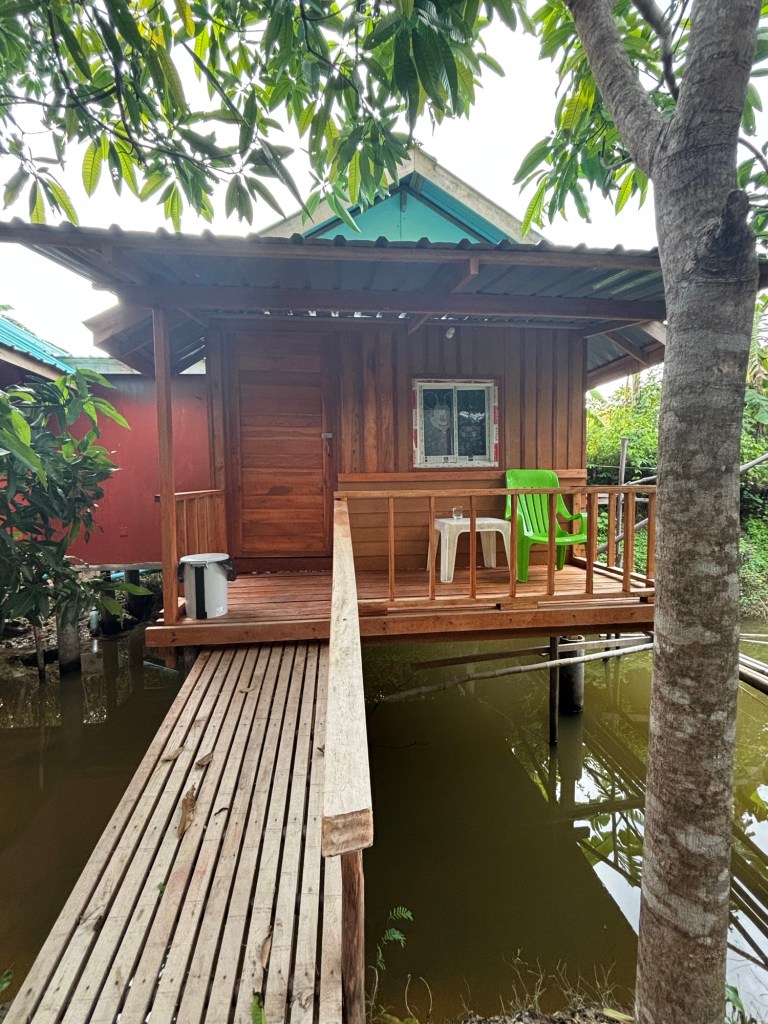The bungalow we’re staying in at Lanta Dareen Garden Home on Koh Lanta may be £3.80 each a night and only has a fan but it’s amazing! As it’s above a small pond it stays very cool in the evenings and even comes with a free breakfast of fruit and eggs and toast every morning. It’s so good that we’ve extended our stay by six nights!