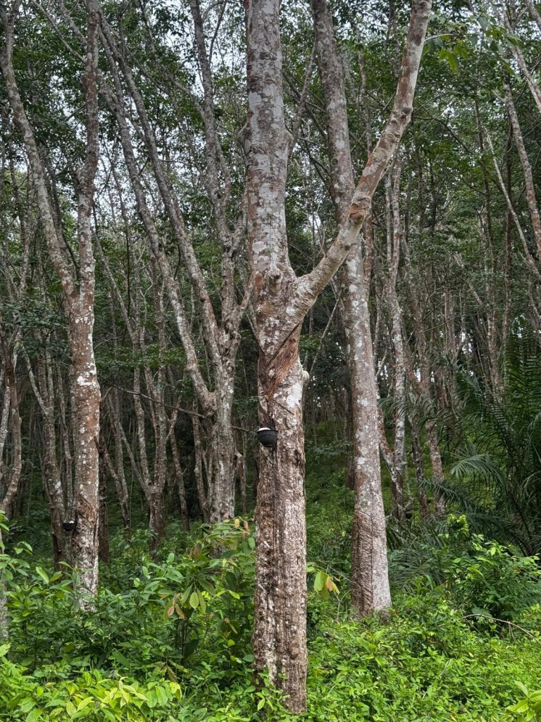 Across much of the inland areas of Koh Lanta there are many rubber tree plantations run by families who live on the land. You can see the latex sap collecting in the black cups.