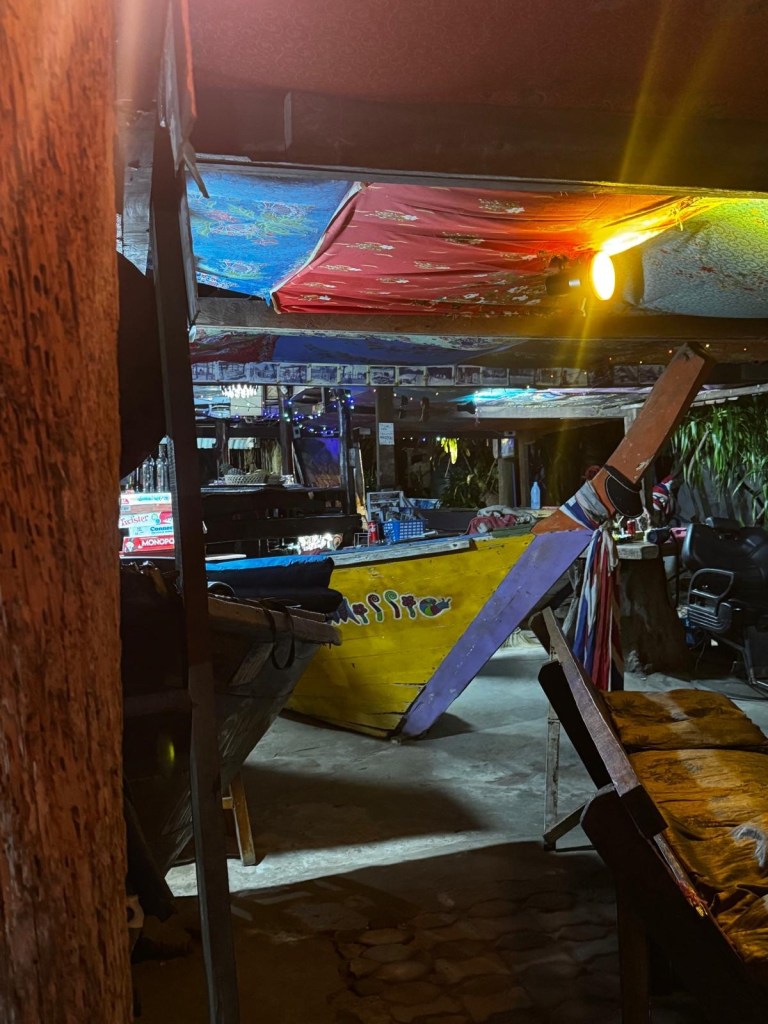 Inside the bar they have incorporated the wreckage of a couple longtail boats that were also destroyed.