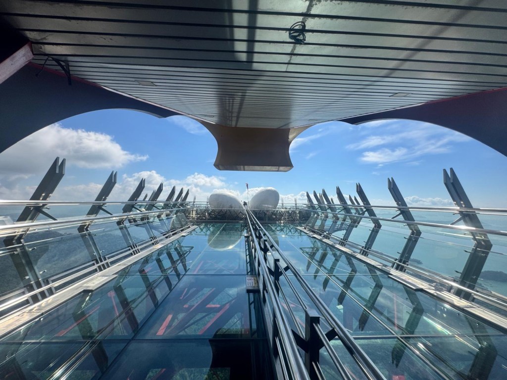 After avoiding the many macaque monkeys it hit us what we had signed up for. At 650m above the ground and overhanging the mountain by 38m, The Eagle’s Nest Skywalk is the longest freestanding skywalk in the world…. and has a complete glass floor!