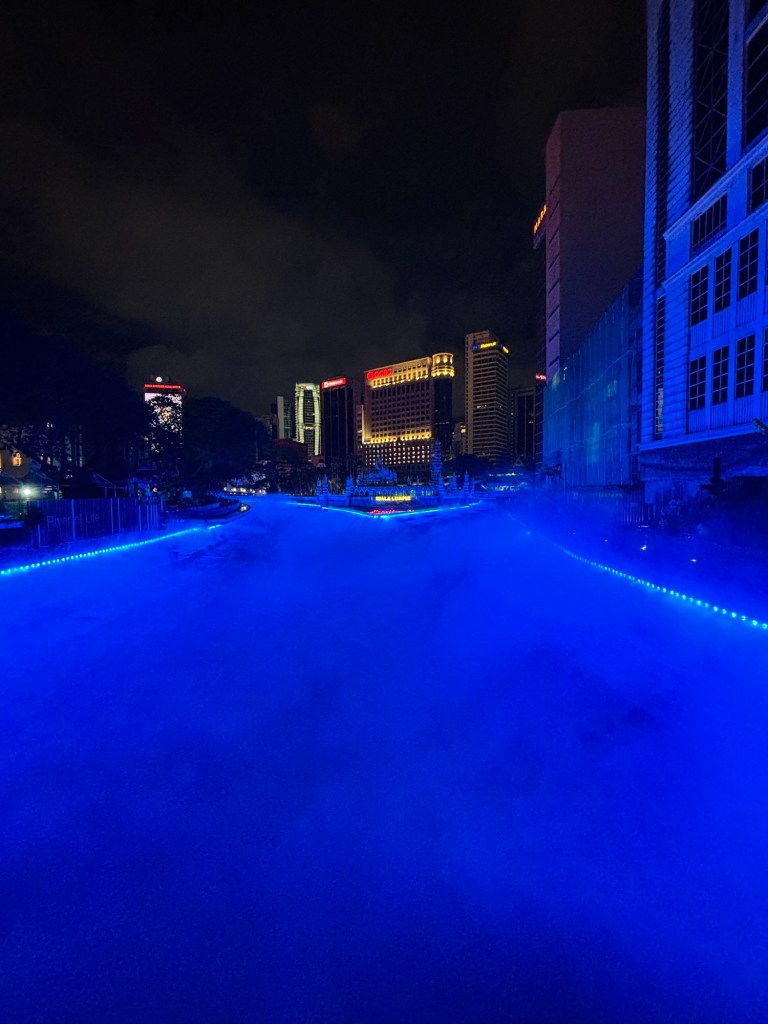 In the evening we went to check out the ‘River of Life’ area. It’s where the Klang and Gombak rivers converge. At night water vapour is pumped from the walls and then it is all illuminated in a cobalt blue creating a magical atmosphere.
