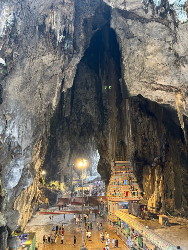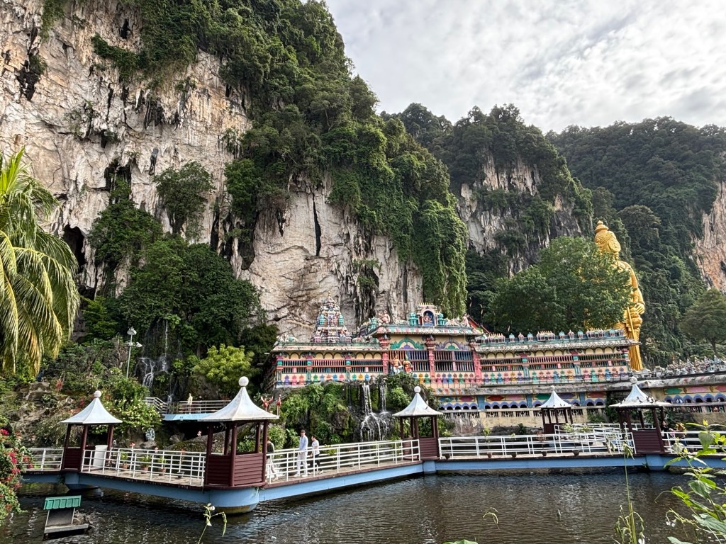 Batu Caves is a 325m mogote (steep sided hill) with a series of limestone caves located around 13km outside of KL central. There is a Murugan statue which is 43m high, making it one of the largest in the world.