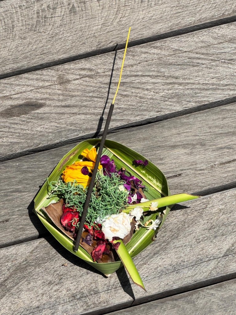 Every morning we noticed the locals put out small banana leaf parcels around their properties which we found out are called Canang Sari. It’s one of the daily offerings to thank the 9 divines for the peace in the world. When there is a death in the family or community the offering is paused.