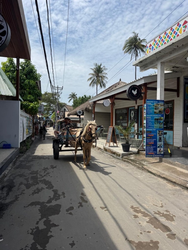 Gili Air is one of the three islands that make up the Gili Islands. Its name translates to ‘Small island with water’ as it the only Gili island with underground freshwater. On the Gili Islands motorised traffic is banned so most people get around on bikes or by horse-drawn carriages called Cidomos.