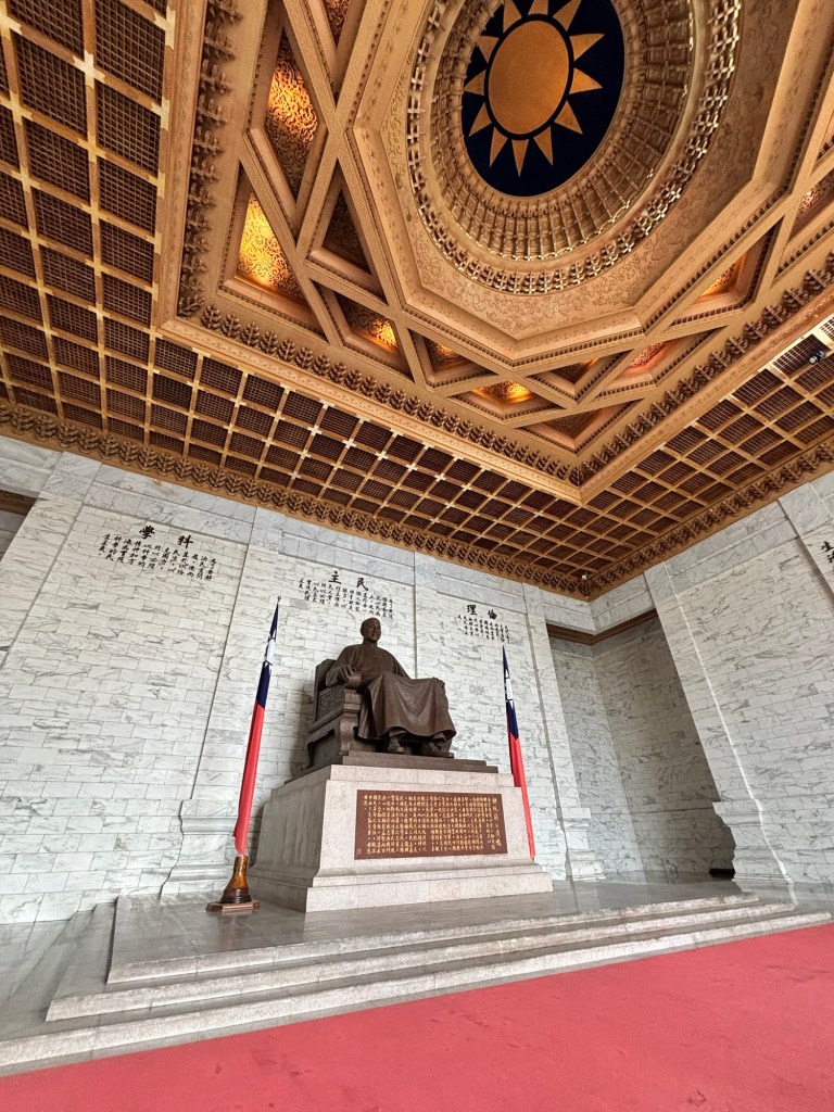 There are 89 steps leading up to the Memorial Hall representing the age at the time of Chiang Kai-shek’s death. The building is white with a blue tiled roof representing the colours on the flag. Inside the hall is a giant 6.3m high statue of the past president.