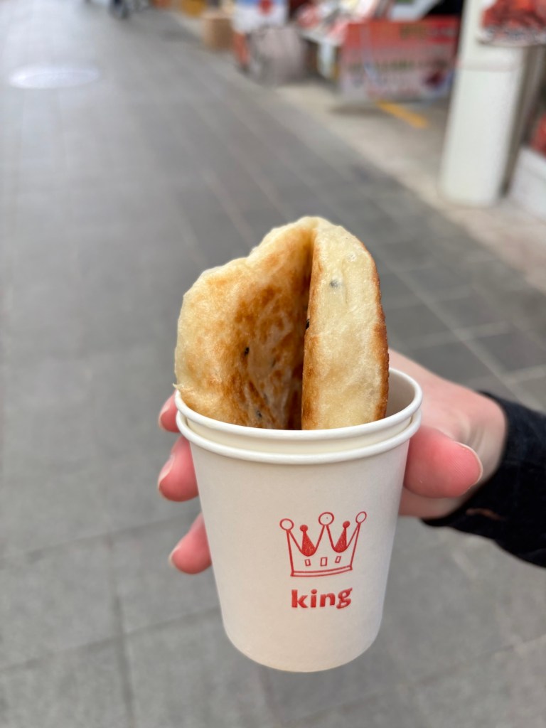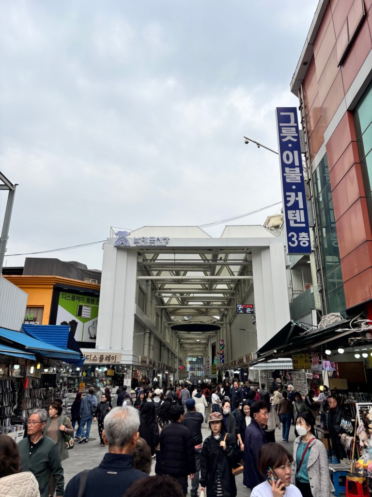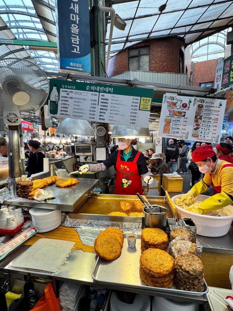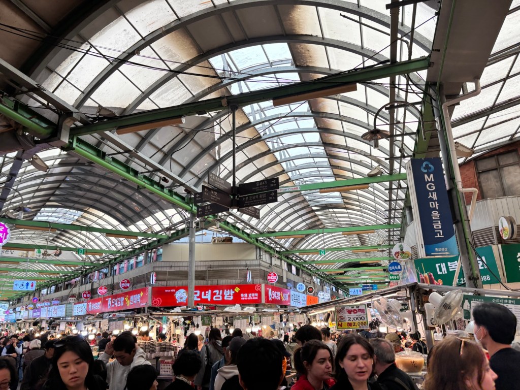Yesterday we started our day with yet another market, this one being called Gwangjang Market. It’s very popular for its wide range of street food stalls and is a very popular place for locals to eat. We tried a traditional Bindae-tteok (mung bean pancake) which is a savoury, crispy pancake made with ground beans and vegetables.