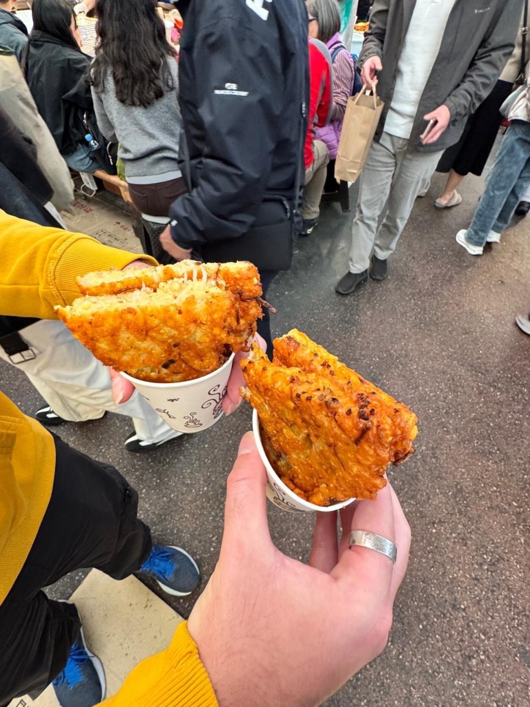 Tasha tried a modern version of a traditional Hotteok (a thick, pillow like pancake) with Gorgonzola cheese and honey inside. It was very hot!