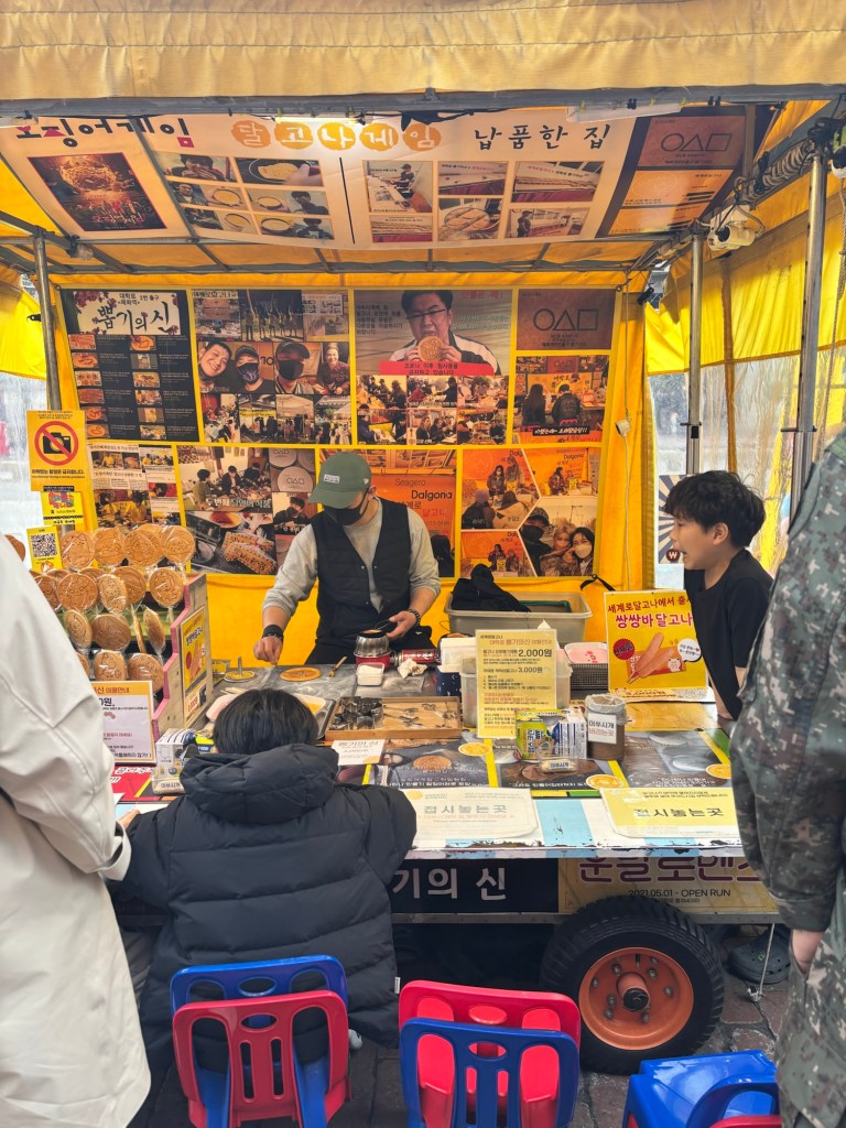 On Sunday we went on the hunt to find the original dalgona biscuit maker who made all the candies for the Squid Game Netflix series. After some research and avoiding the hundreds of copycats around the city we found An Yong-hui’s stall near Hyehwa station.