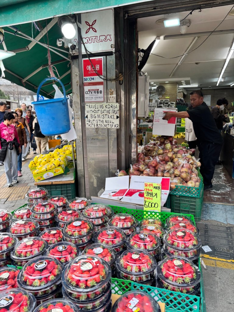 Just by the metro station was a fruit stall and we just couldn’t resist getting some of the enormous strawberries. South Korea has become a massive strawberry producer and they have become very popular abroad for their higher sugar content and juicy taste as a result of almost exclusively being grown in greenhouses.
