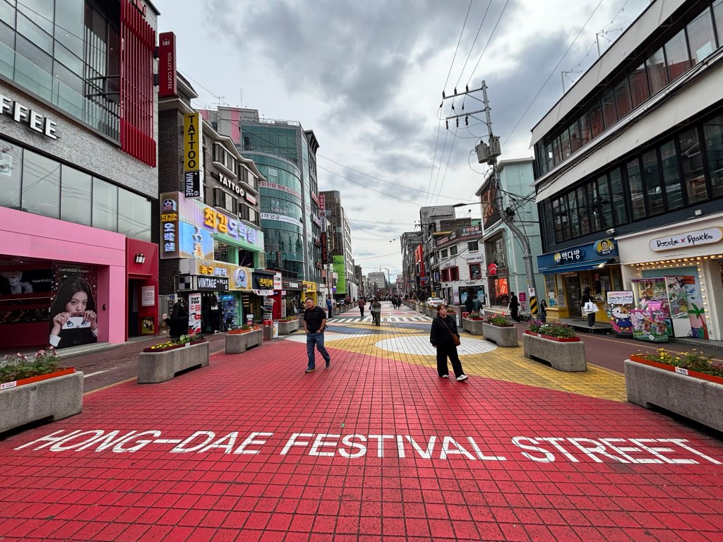 We spent the afternoon exploring the Hongdae district which is centred around Hongik University making it an area with vibrant nightlife, themed cafes, arcades and lots of street busking.