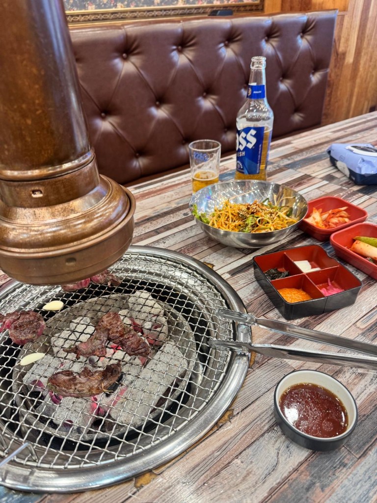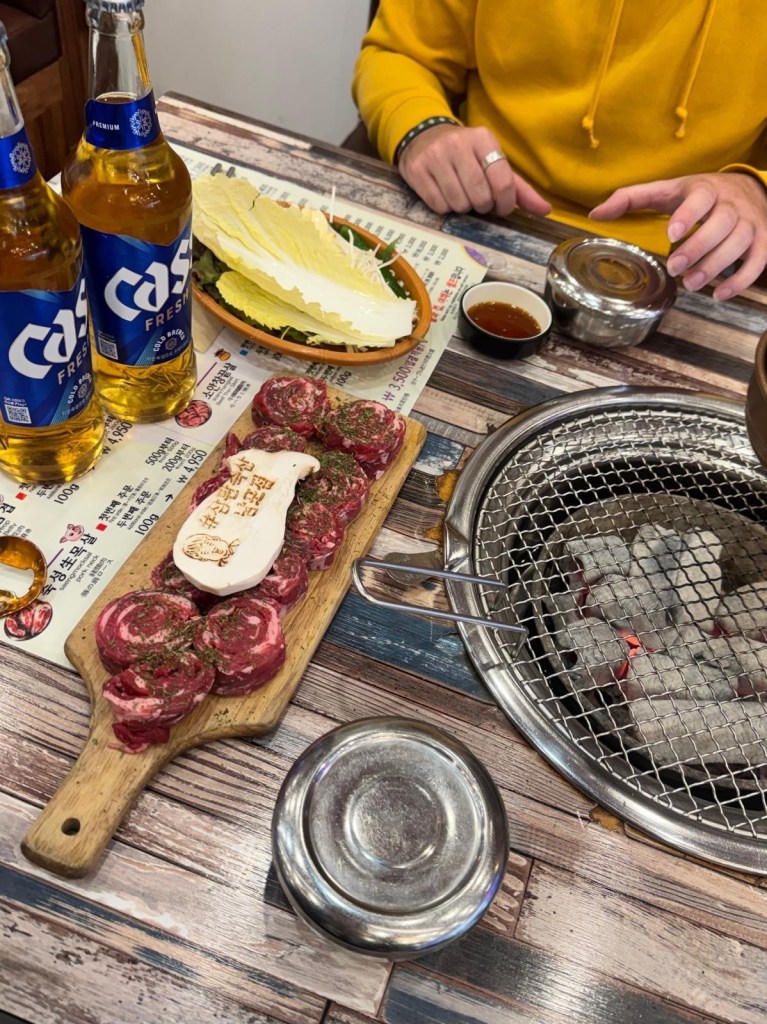 In the afternoon, we went for a traditional Korean BBQ as we felt we had to try one before leaving Korea. After placing our order for the type of beef we wanted the coals turned up and we were off cooking…