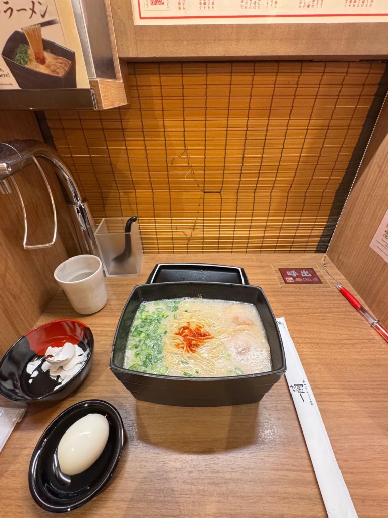 For lunch, we tried our first bowl of ramen at the big chain Ichiran. It’s designed to let you enjoy a meal without social distractions with individual booths, ticket machine and ordering forms.